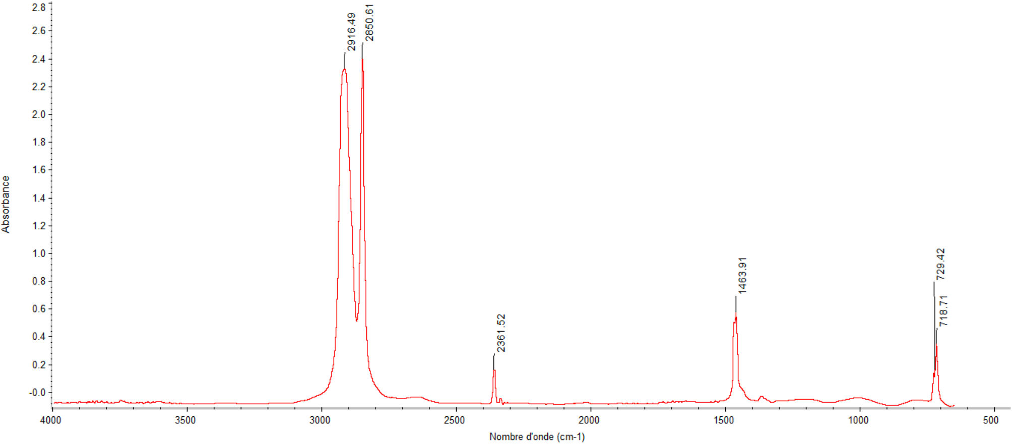 La spectroscopie FTIR est une technique analytique permettant de caractériser la composition chimique des matériaux en mesurant l’absorption de la lumière infrarouge par les molécules. Chaque liaison chimique absorbe l’énergie à des longueurs d’onde spécifiques, générant ainsi un spectre unique. La Figure 1 illustre un exemple de spectre FTIR.